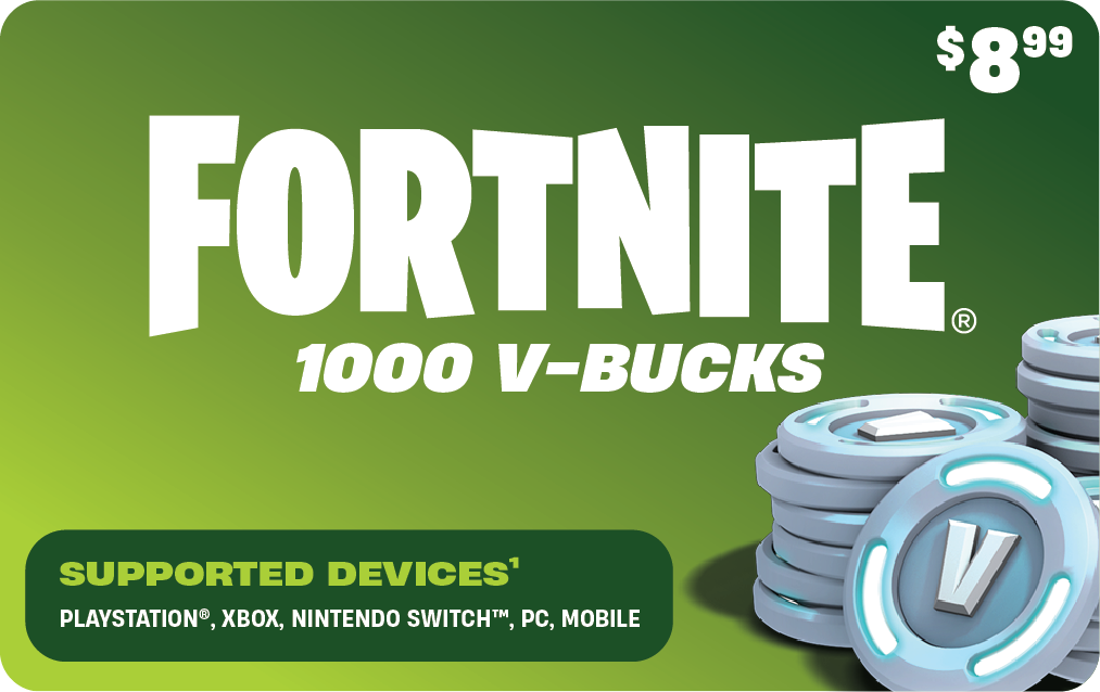 1,000 V-Bucks - Epic Games Store 1,000 V-Bucks Buy 1,000 Fortnite V-Bucks, the in-game currency that can be spent in Fortnite Battle Royale and Creative modes. You can purchase new customization items like Outfits, Gliders, Pickaxes, Emotes, Wraps and the latest season's Battle Pass! Gliders and Contrails may not be used in Save the World mode. Genres Action Shooter Features